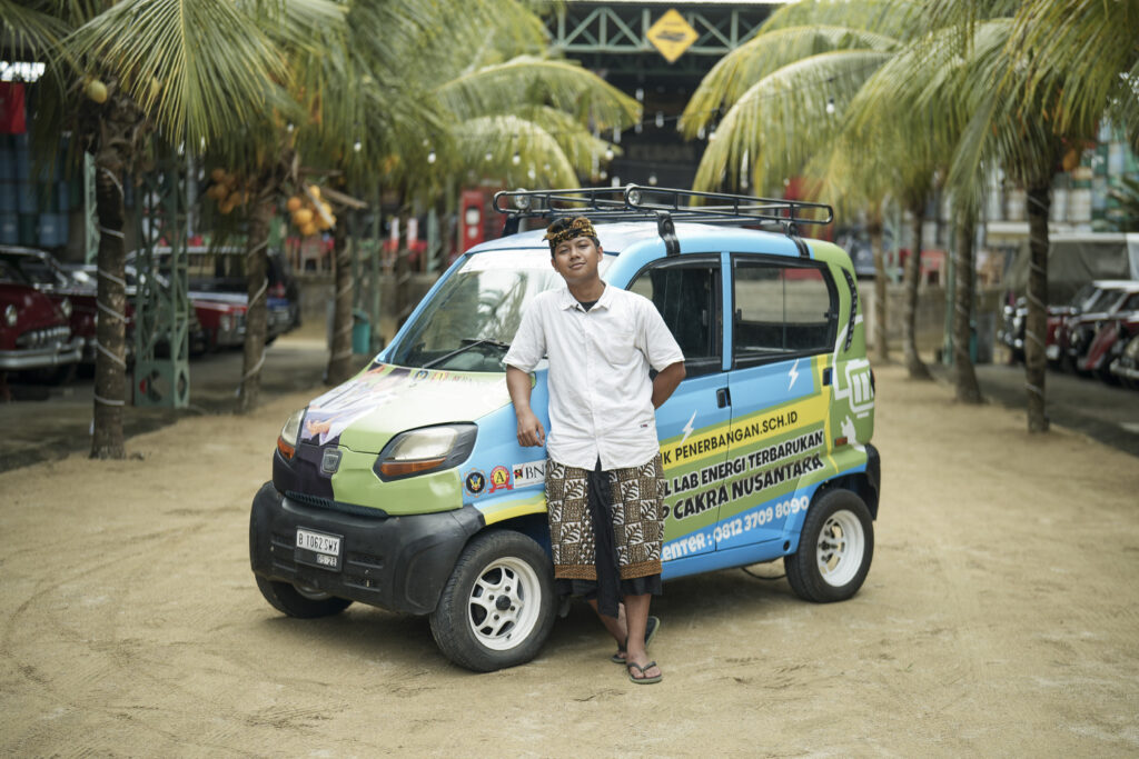Rafli Geananda, a student at SMK Penerbangan Cakra Nusantara majoring in renewable energy engineering, helped convert a petrol-powered Bajaj Qute – a compact four-wheel vehicle – into an electric vehicle.